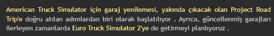 → Project Road Trip için garajları şimdilik sadece ATS’ye getirmek istiyorlar. Eğer daha sonra ETS 2’ye gelecek olan garaj modelleri aynı ise tepki fırtınası çıkabilir…