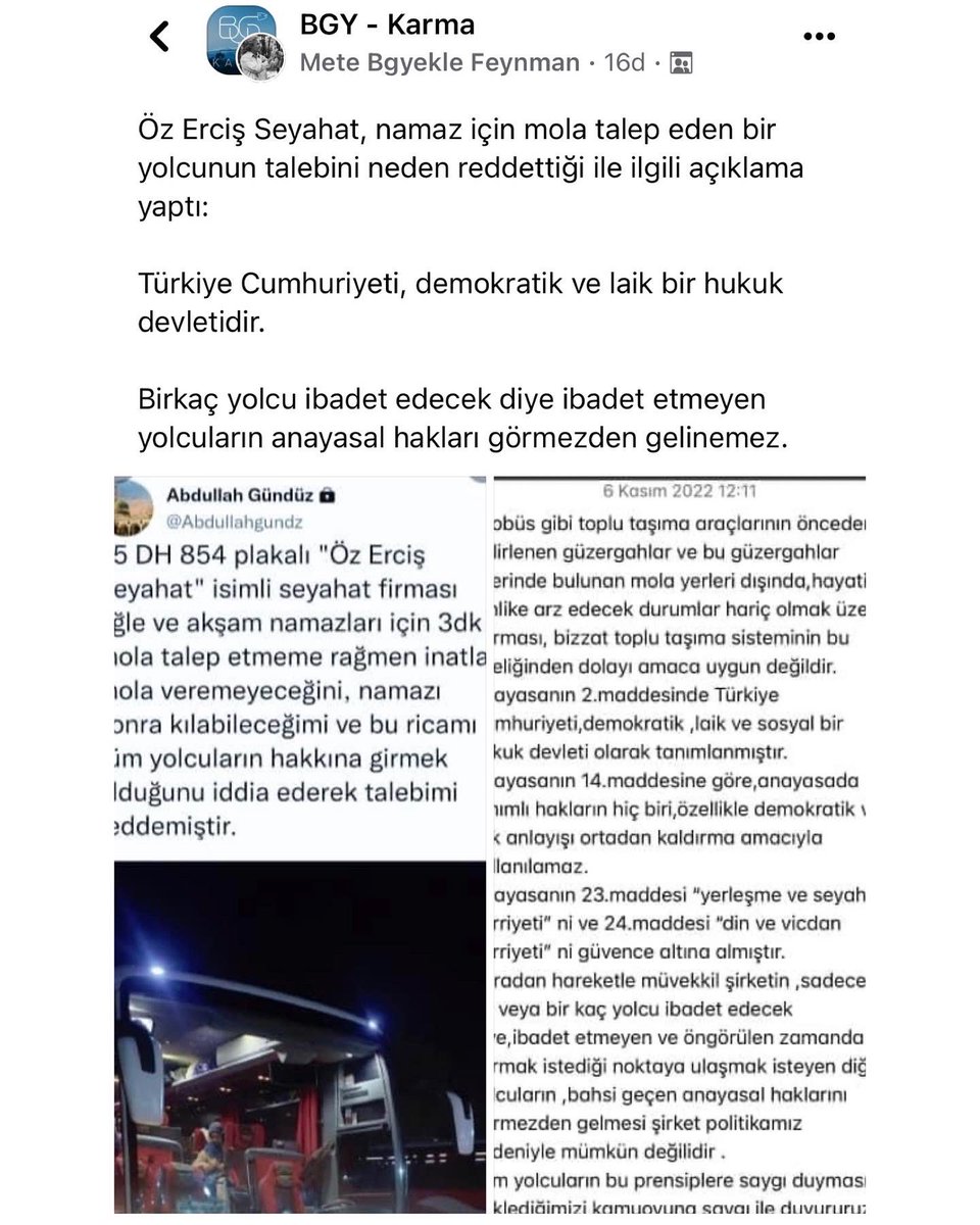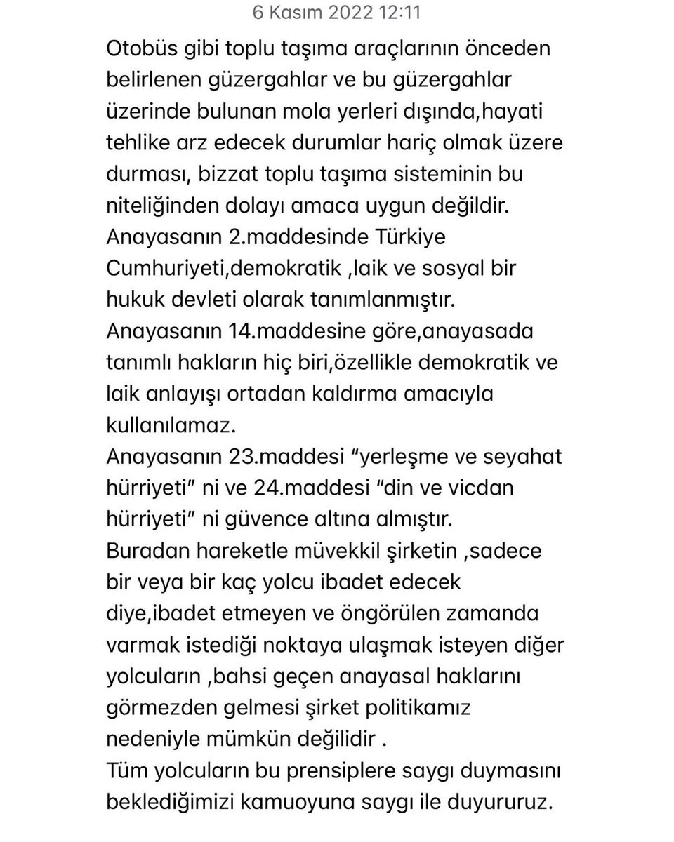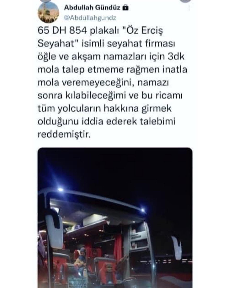 Firma sonuna kadar haklı. Kazaya bırakıp daha sonra da kılınabilir. Hastaneye ölüm döşeğindeki yakınını görmeye giden, geleceğini belirleyecek bir iş görüşmesine giden insanlar da var o otobüste. Her sene belirli dönemlerde şehirler arası otobüs namaza durmadı haberleri yapılıyor ve bundan gına geldi artık. Keşke insanlar biraz daha bilinçlense artık bu konuda