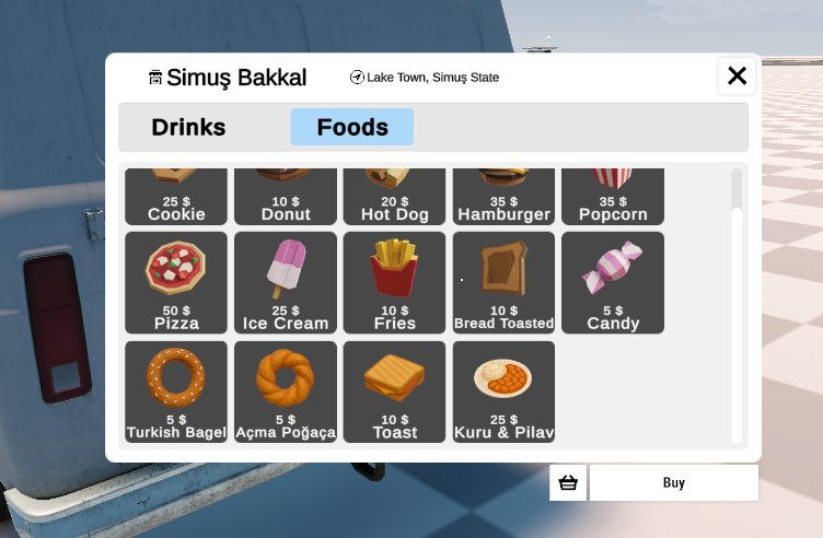 bugün ssitemi bir araya getiriyorum. güzel bir altyapısı oldu. malum her yerde farklı food cart, food truck, küçük market vb.dükkanlar olacağından her yerde aynı ürünler çıkmaması için sattığı ürünler ayrı oluyor. nerede olduğunu da göreceğiz. üzerine tıklayınca satın alınıyor ama daha arayüz işi var her yerde bu basitlikte olması gerekiyor. gas station marketinden bira alamazsın mesela