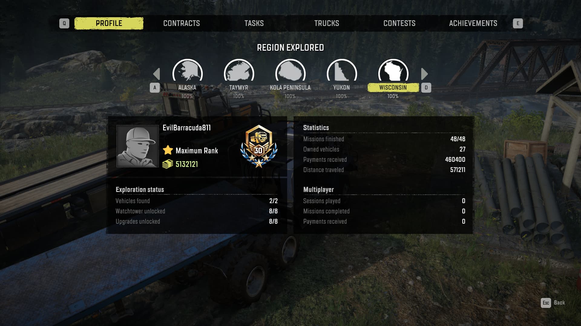Yukon’u da kolayladım artık sadece odun teslimatları kaldı. Başlarda çamurlu, karlı yerler zordu ama gidiş geliş yollarını öğrenince çok kolay oldu. Tek sıkıntı çok malzeme isteyen kontratlarda aynı şeyleri defalarca tekrarlıyorsunuz. Arada sıkılıp Wisconsin haritasını dolaşmıştım orası güzel yeşillikli. Ardındanda Amur var başka dlc almadığım için son iki haritam kaldı.